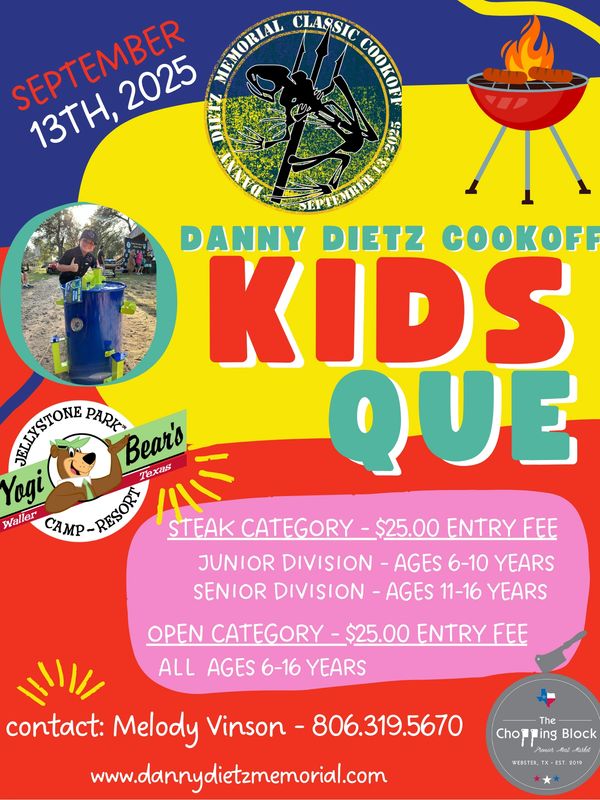 There are two age groups for steak and one for the open– contestants must be at the age noted at the time of the contest, not the time of registration. Danny Dietz Memorial Classic Kids Que rules apply unless otherwise noted. Each entry submitted will consist of one cook only.